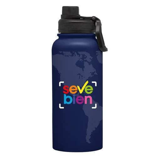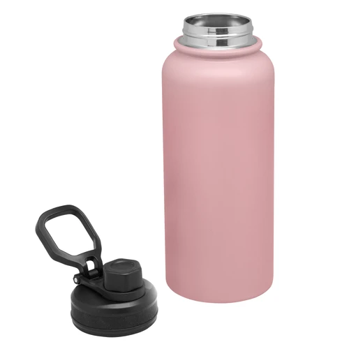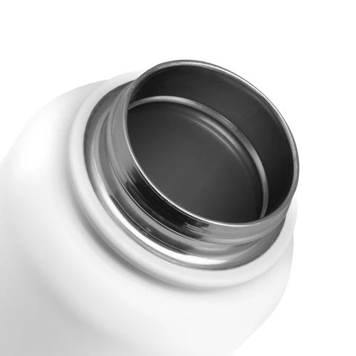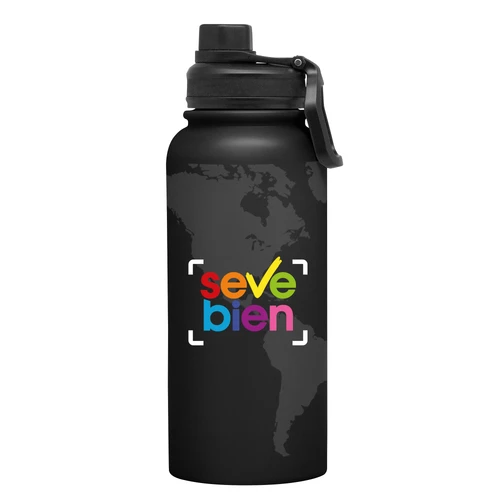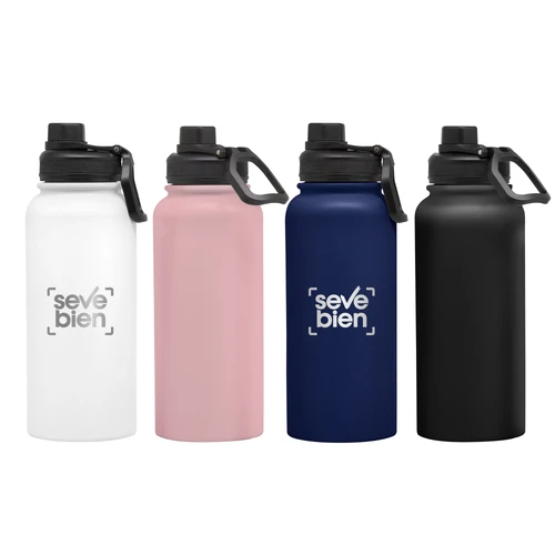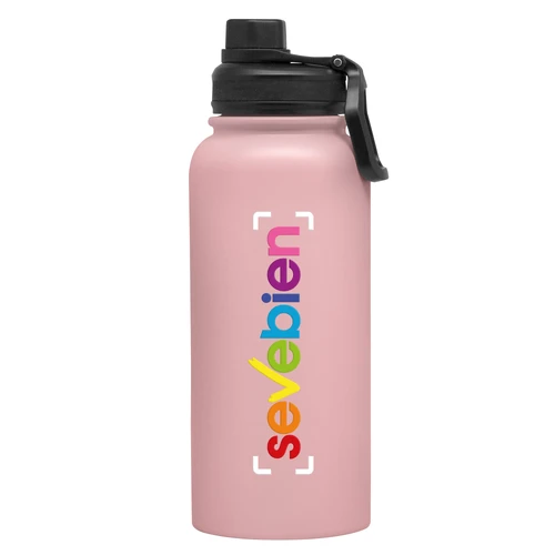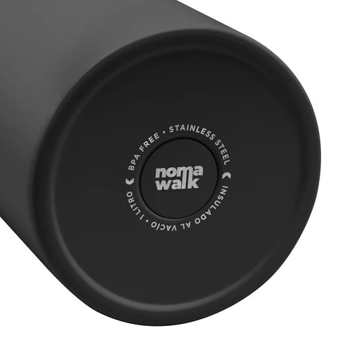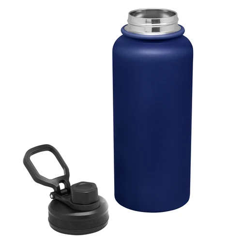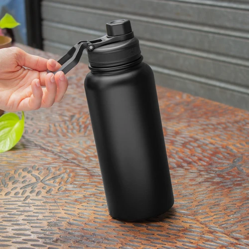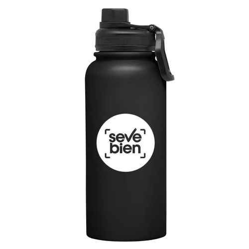 Ø 9 x 26 cm. Capacidad 1000 ml. Acero inoxidable. Botella deportiva doble pared, sellada al vacío. Interior en acero 304, exterior en acero 201. Tapa con anillo de silicona, boquilla con cierre a rosca antiderrame y manija plástica para su agarre. Mantiene hasta 12 hs la temperatura de las bebidas calientes y hasta 24 hs la de las bebidas frías. Presentación en caja de regalo.