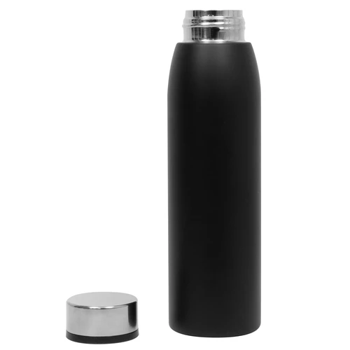 Ø 7 x 26 cm. Capacidad 750 ml. Botella doble pared, sellada al vacío. Interior de acero 304 y exterior de acero 201. Cuerpo color negro y tapa a rosca de acero. Mantiene hasta 12 hs la temperatura de las bebidas calientes y hasta 24 hs la de las bebidas frías. Presentación en caja de regalo.