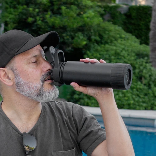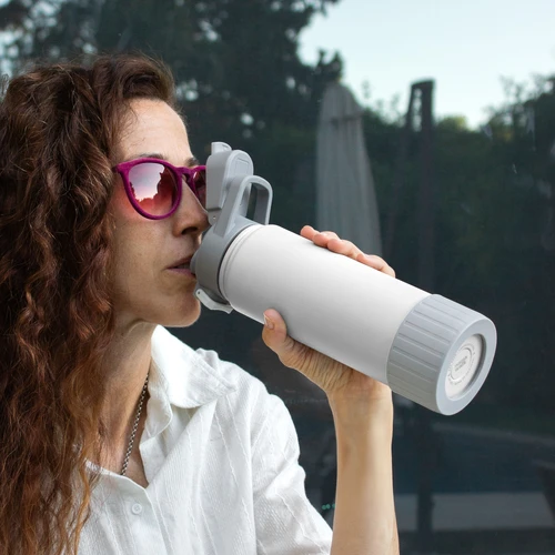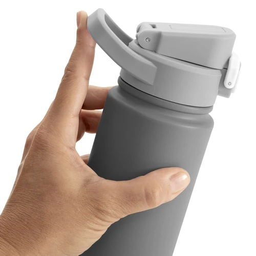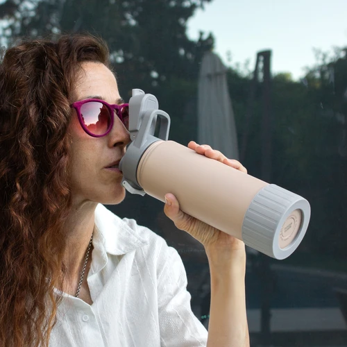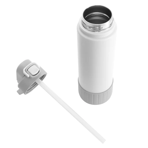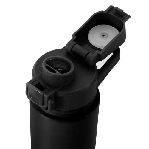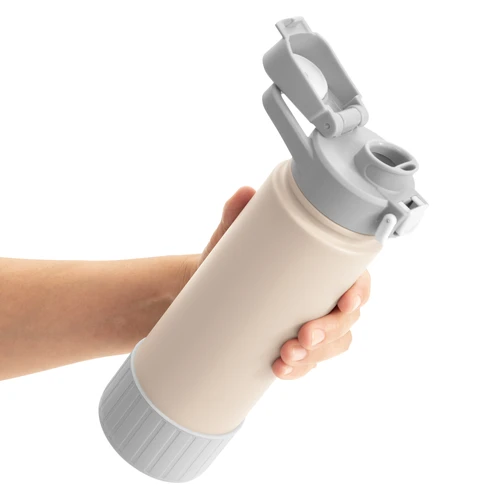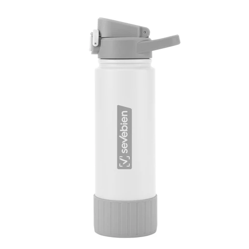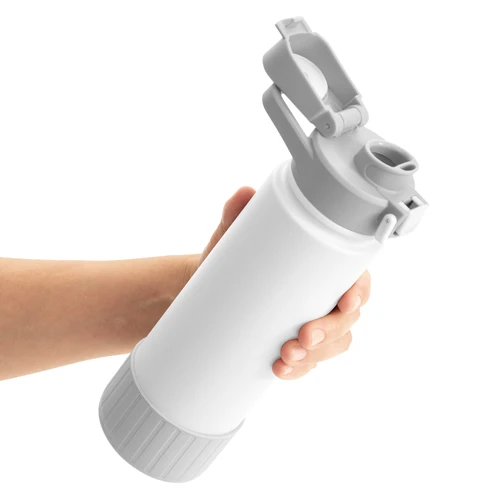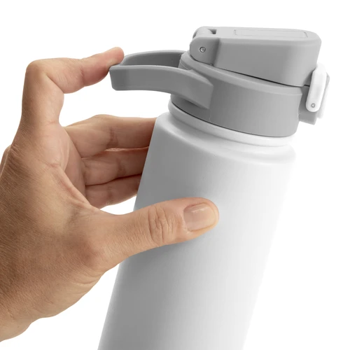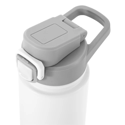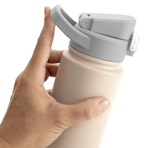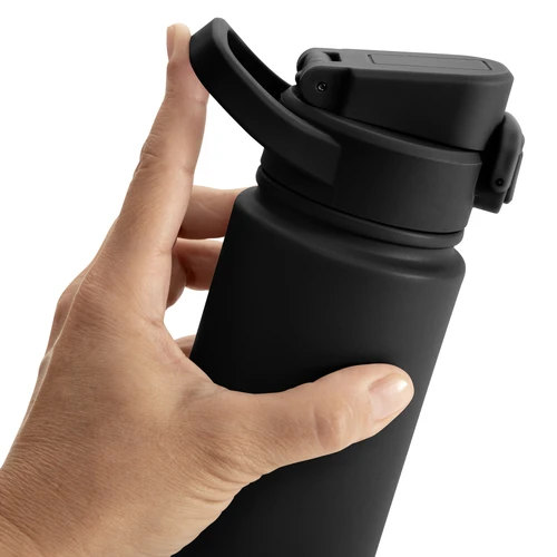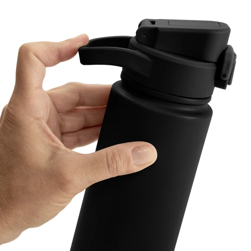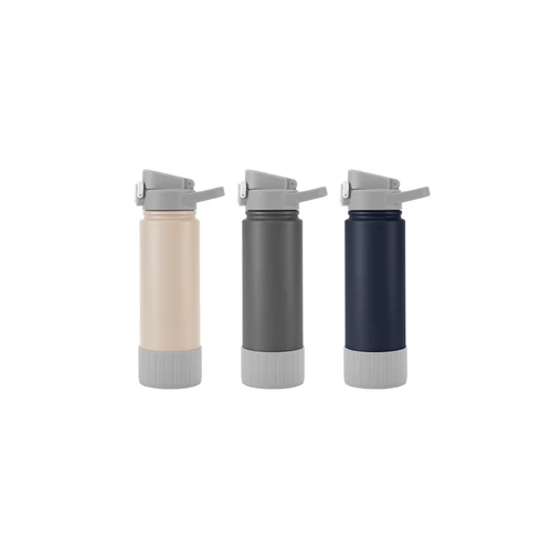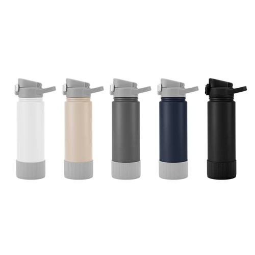Hidratación que acompaña tu ritmo.Botella deportiva con doble pared, sellada al vacío. Interior de acero 304 y exterior de acero 201. Pintura powder coat (pintura más duradera y resistente a la corrosión y el paso del tiempo). Tapa plástica a rosca con anillo de silicona combinada con tapa rebatible a presión y traba de seguridad antiderrame. Asa flexible y resistente de TPE. Boquilla con bombilla incluida. Base con grip de silicona del mismo color de la tapa. Mantiene hasta 12 hs la temperatura de las bebidas calientes y hasta 24 hs de las bebidas frías. Medidas: Ø 7,5 cm x 26,5 cm. y ancho de tapa 11 cm.