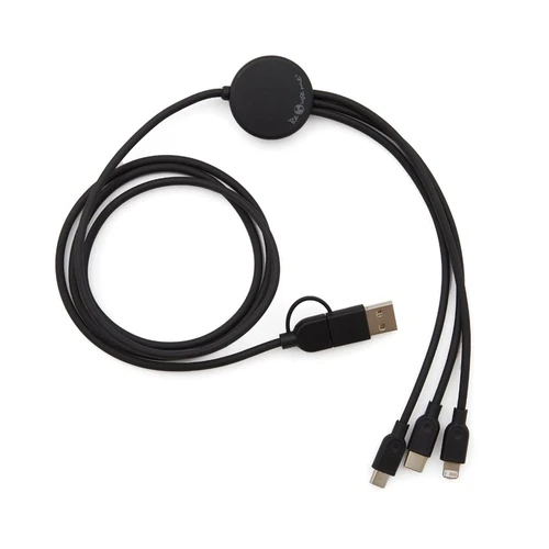 Cable 3 en 1 color negro. Es el accesorio perfecto para mantener tus dispositivos siempre cargados y listos para usar. Cuenta con un cable de entrada tipo C con adaptador USB A y 3 cables de salida TIPO C / MICRO B / LIGHTING, lo que te permite cargar dispositivos con diferentes tipos de entradas. También, cuenta con un accesorio redondo de bamboo de donde salen los 3 cables. ReUseMe