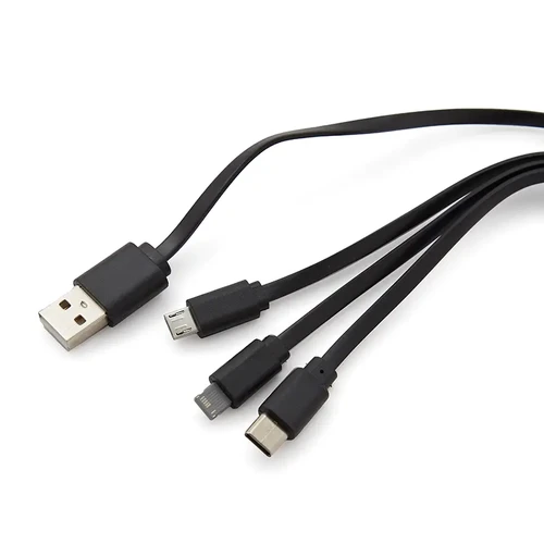 Cable 3 en 1 color negro, con una longitud de 30 cm. Es el accesorio perfecto para mantener tus dispositivos siempre cargados y listos para usar. Incluye un cable de entrada USB A y 3 de salida TIPO C / LIGHTING / MICRO B. Cuenta con accesorio rectangular de Wheat Straw, pasta de tallo de trigo, un material sustentable que reduce el consumo de plásticos vírgenes, de donde salen los cables y una cuerda de silicona.