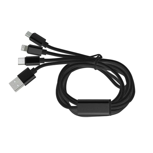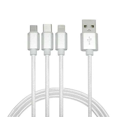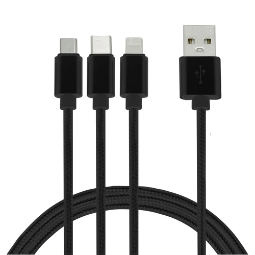 120 cm. Aluminio y Nylon. Cable con entrada USB y diferentes adaptadores: Iphone, Type C y Android. Viene dentro de una bolsa plásticas con cierre ziploc.