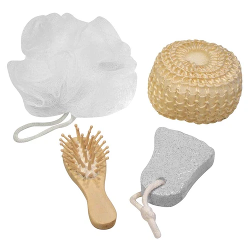 Canasto SPA de belleza en madera modelo "Naturals". Contiene cepillo de pelo, esponja malla, piedra pomez y esponja de masaje corporal.
