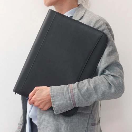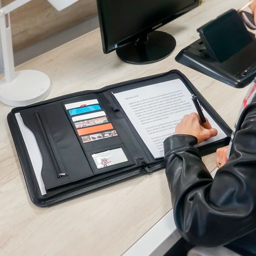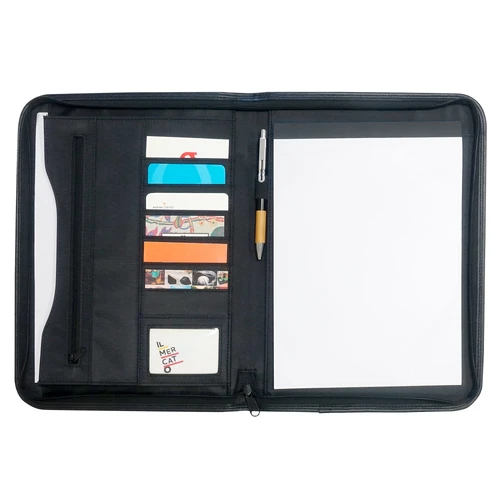 26 x 35 x 3 cm. Poliuretano. Carpeta con cierre. Contiene 1 bloc de 20 hojas lisas tamaño A4. Porta bolígrafo. Bolsillo externo. Compartimentos internos para 7 tarjetas. Sobre con fuelle y bolsillo interno con cierre. Diseñada con materiales que poseen algunos beneficios ambientales sobre el cuero genuino, ya que no requiere de animales para su fabricación y además, no necesita ser químicamente curtido.