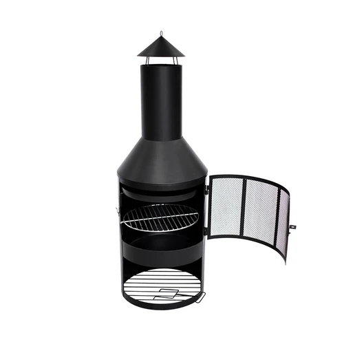 Chimenea de Exterior, para Carbón o Leña, de Acero negro, modelo "OREGON". Con 3 compartimentos: inferior para almacenaje de leña o carbón, medio para hacer fuego, superior para tiraje de humo. Fácil de armar y transportar.