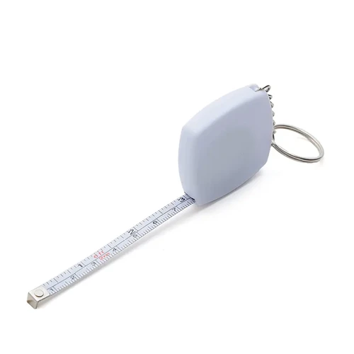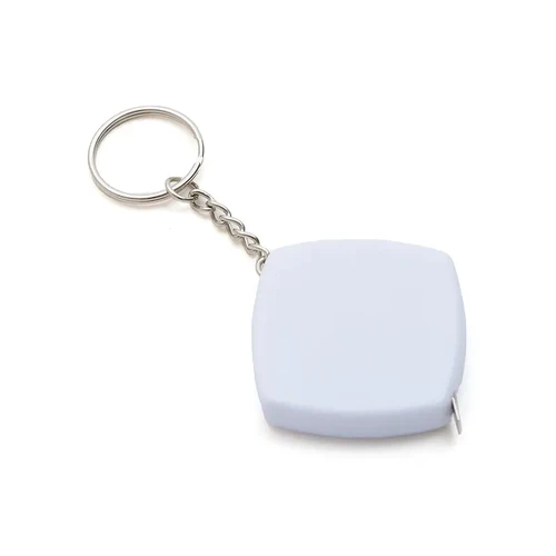 Llavero con cinta métrica retráctil fabricado en ABS y cloruro de polivinilo, garantizando resistencia y durabilidad.