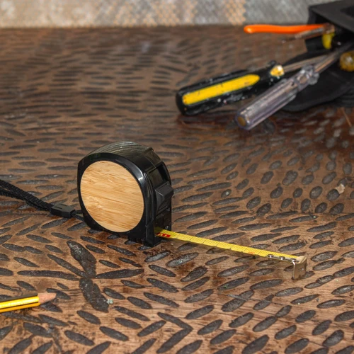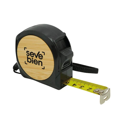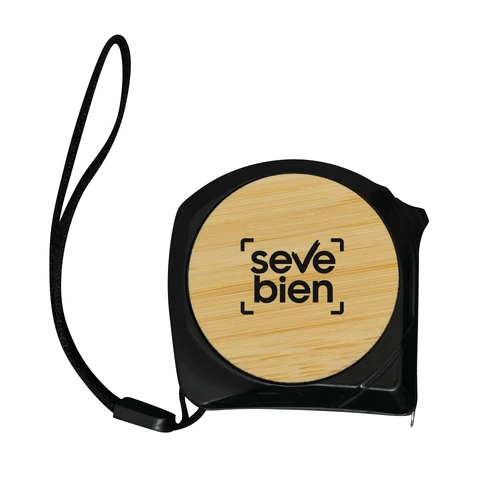 Compacta y lista para todo.Cinta métrica. 3 metros de longitud. Cinta de acero inoxidable con traba de seguridad y clip sujetador metálico. Estructura de ABS con detalle circular en bambú. Correa de poliéster. Medidas: 6 x 6 x 3,4 cm.