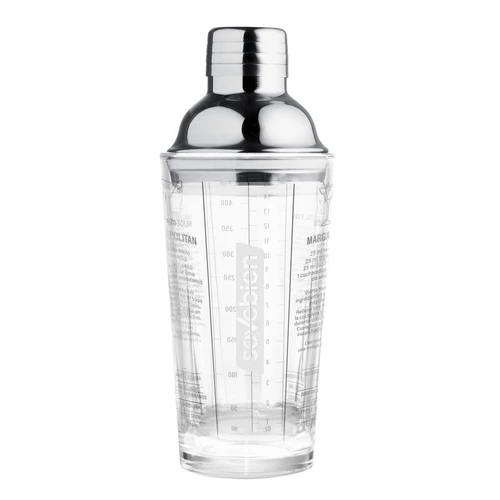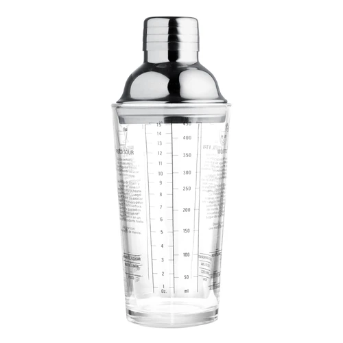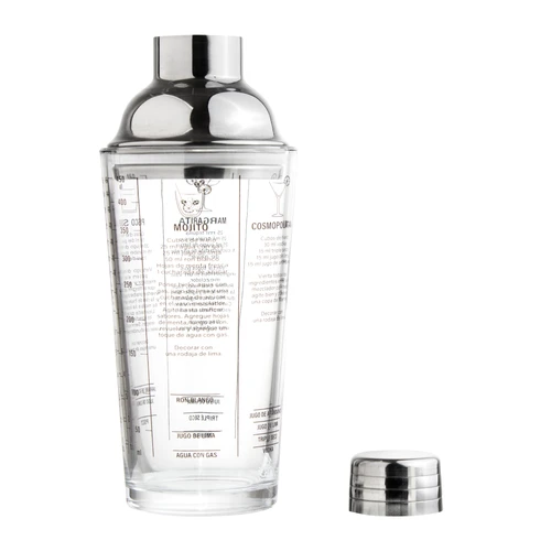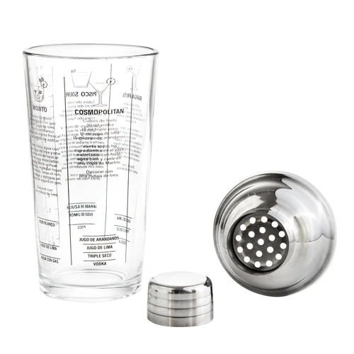 Ø 8cm x 21,5cm. Capacidad 450 ml. Vidrio sodocálcico y acero inoxidable. Coctelera de vidrio. Tapa de acero 202 con junta de silicona. Impresión de tragos en español en el cuerpo de vidrio. Presentacion en caja de regalo kraft.