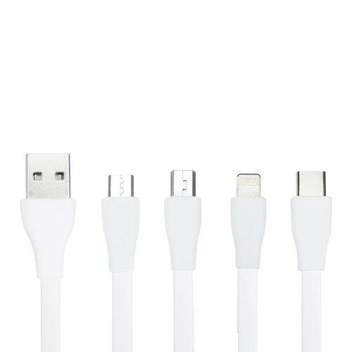 Connect Multicargador 5-en-1 con cables plásticos TPE engomado blanco y base plástica ABS blanco con mosquetón. Multi-cables con terminales de carga USB / Micro USB / Mini USB / Lightning / Type C. Compatible con dispositivos Android, Apple y Type C. Presentación en elegante bolsa OPP con orificio para colgador de ganchera. Producto con aprobación CE, ROHS, FC.