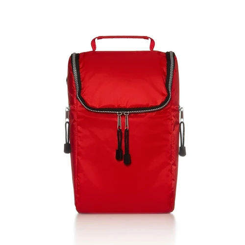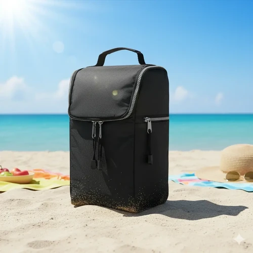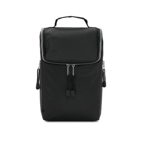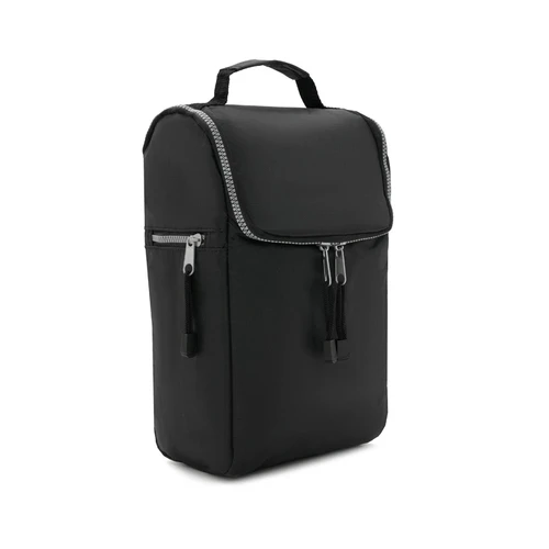 Cooler confeccionado en tela Nylon 600D, interior térmico forrado en PVC gris. Bolsillos laterales. Apto para llevar botellas, termos y otros.