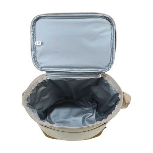 Bolso cooler "ICELAND" con exterior de tela PET reciclada (RPET) color beige e interior térmico aislante de PEVA y acolchado con esponja PE FOAM. Incluye bolsillo delantero, asa larga para colgar al hombro, mango y cierre-eclair con apertura 300°. Base de Nylon Ripstop impermeable color café. Capacidad 8.5L.