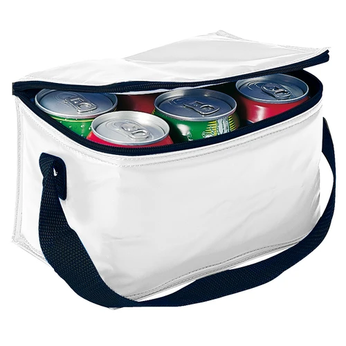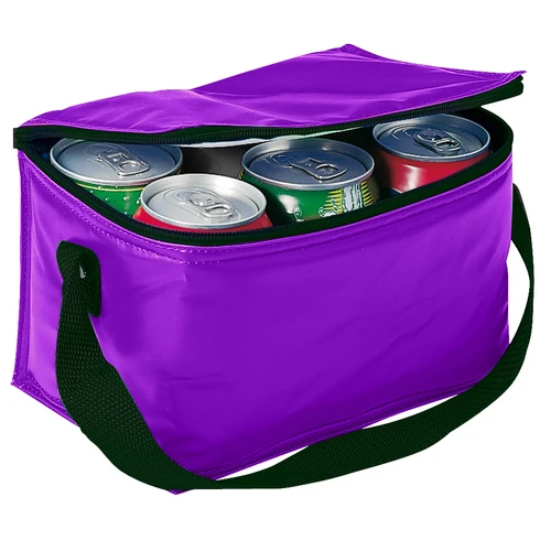 Cooler para 6 latas de bebidas o cervezas, también utilizable como lonchera. Tela exterior 420D/PVC Poliéster. Tela interior PVC metalizado aislante.