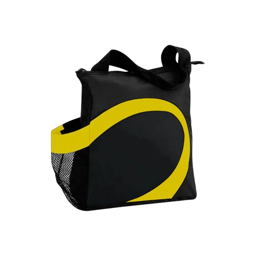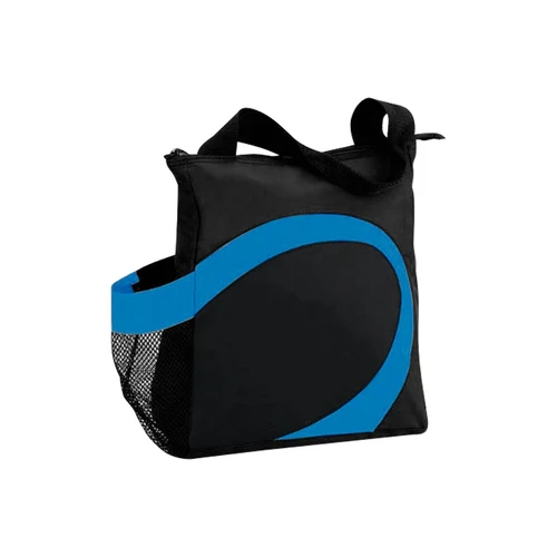 Cooler modelo "Wave". Tela exterior Polyester 70D/PVC. Tela interior plateada aislante 15C PEVA + relleno 3mm esponja PE. Cierre cremallera superior. Incluye bolsillo lateral en tela malla.