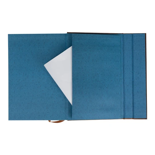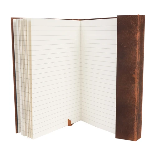 Cuaderno tamaño A5 modelo "OLD", con tapa dura de cartón encerado envejecido mate de 750gsm, con 96 finas hojas gruesas amarillas lineadas de 120g. Interior forrado con funda. Contiene cierre metálico imantado. Y banda separador de hojas color marrón.