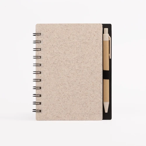 BARÚ es un Libreta de formato compacto (11 × 16 cm) diseñado para acompañarte en cada idea, lista o pensamiento. Sus tapas flexibles están hechas de fibra de trigo, una alternativa ecológica al plástico tradicional que aporta ligereza y textura natural al tacto. Con 80 hojas lineadas en papel marfil de 70 g y espiral lateral para fácil manejo, BARÚ también incluye un bolígrafo de papel con detalles en fibra de trigo, creando un set completo, funcional y personalizable. Es la elección ideal para marcas que buscan promover la practicidad sustentable en cada detalle del día a día.