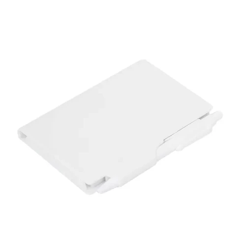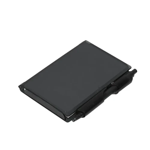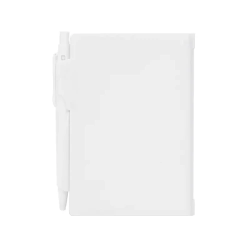Cuaderno Plástico con tapa dura de PS y porta bolígrafo. 80 hojas lisas. Incluye bolígrafo. Medidas: 10,4 x 7,8 cm.