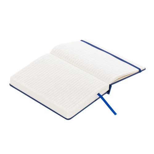 Cuaderno tamaño A5 modelo "ROMA", con tapa dura de cartón piedra de 2.0mm forrado en Eco-Cuero PU. Contiene 192 finas hojas lineadas amarillas FSC IVORY PAPER de 80g/m2 + 4 hojas de 140g/m2 con 1 bolsillo interior en la última hoja. Contiene elástico para cierre de 8mm de ancho y banda separador de hojas al tono de 6mm de ancho. Presentación en fina caja con tapa de regalo de cartón piedra de 2.5mm forrado en papel al tono de 80g/m2.
