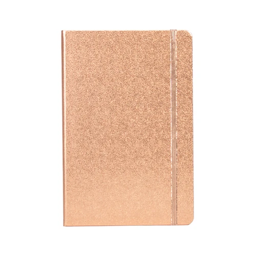 Cuaderno tamaño A5, con cubierta de cartón piedra forrada en PU color cobre de 1.5mm de espesor, interior 80 hojas amarillas lineadas de 80 gsm. Incluye banda elástica y huincha separador de hojas al tono. Presentación individual en bolsa de polipropileno translúcido.