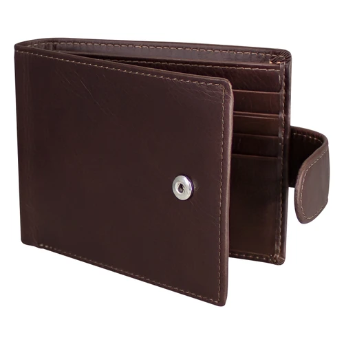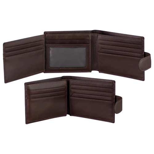 Deluxe Billetera de cuero natural Marrón con broche. Finas terminaciones. 17 compartimentos interiores (3 secciones). Alta resistencia al uso. Presentación en bolsa frozen y caja de cartón forrado negro texturado.
