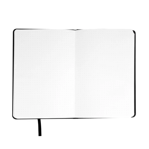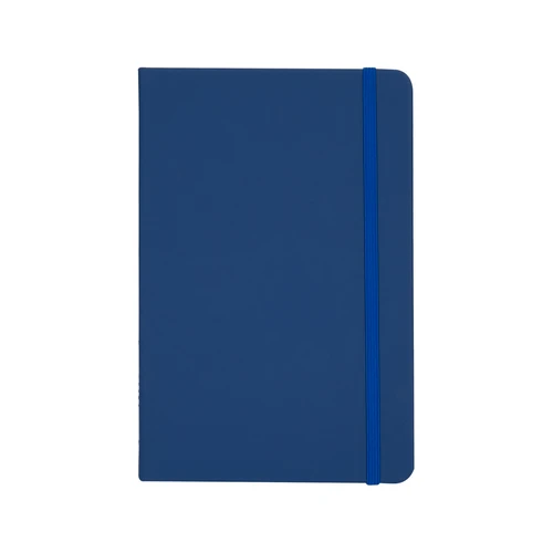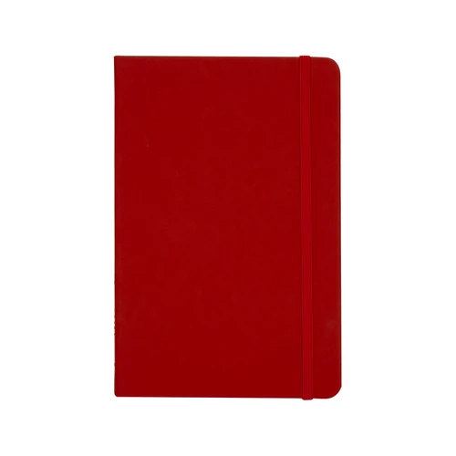 Deluxe cuaderno tamaño A5, con tapas duras de Eco-Cuero PU reciclado, engomado color mate, con 80 finas hojas color crema FSC IVORY PAPER de 80g/m2 con punteado "mental". Contiene elástico para cierre y banda separador de hojas al tono.