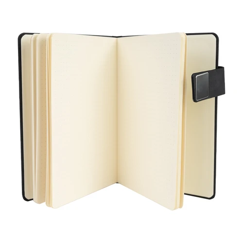 Deluxe Cuaderno tamaño A5 modelo "KEVIN", con tapas de Termo-PU negro mate de 650gsm, con 80 finas hojas amarillas con punteado "mental". Contiene cierre metálico imantado. Y banda separador de hojas color negro.