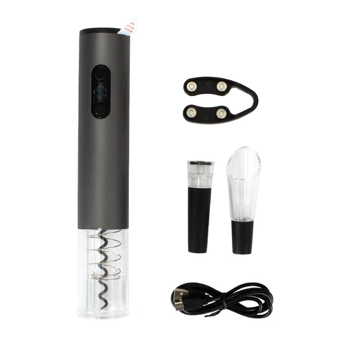 Deluxe Set de Vino Eléctrico con cargador USB/USB tipo C, materialidad plástico ABS negro + acero inoxidable. Contiene: 1 Descorchador eléctrico con luz azul + 1 tapón de goma con vacío + 1 vertedor + 1 cortador sello botella. Potencia Cargador USB: 500mAh. Presentación en caja de regalo con gráfica y fotografía del producto a todo color.
