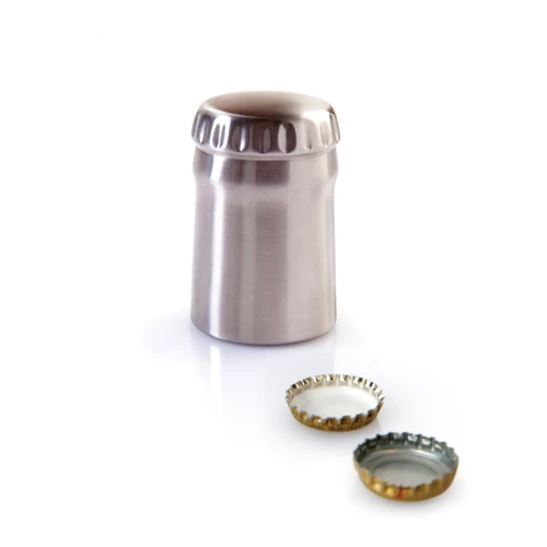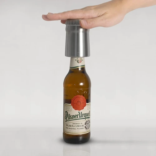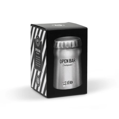 5,5 x 8 cm. Acero inoxidable. Práctico destapador. Posicionándolo en el pico y con una leve presión, se destapa la botella sin abollar la chapita. Gracias a un imán, la tapa queda intacta en su interior. Presentación en caja de regalo.