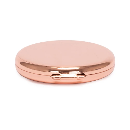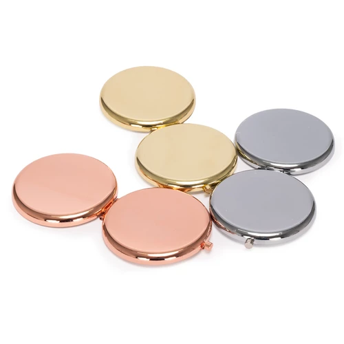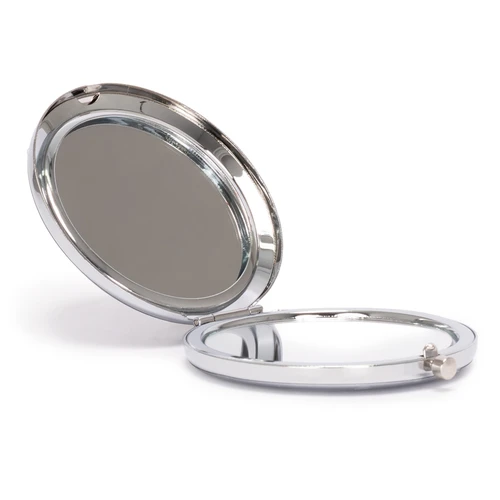 Espejo metálico de Acero inoxidable redondo doble. Interior con 2 espejos: uno normal, el otro con aumento. Presentación en bolsa espuma frozen + caja de cartón laminado negro. IMPORTANTE: este espejo viene con sellos plásticos en ambas caras exteriores, para protegerlo de manchas y rayaduras. Antes de imprimir o grabar logo, preocúpese de retirar los sellos plásticos.