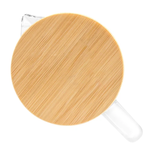 Ø 8,8 x 22,8 cm. Capacidad 1100 ml. Vidrio de borosilicato y bambú. Jarra con pico vertedor y asa de vidrio de borosilicato. Tapa de bambú y acero inoxidable 304 con anillo de silicona antiderrame. Presentación en caja de regalo kraft.