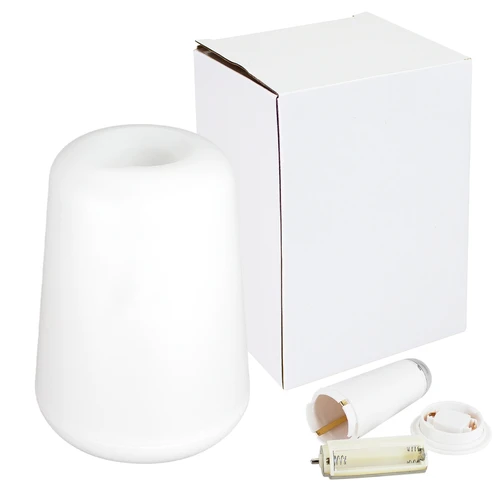 Lámpara de sobremesa de luz cálida amarilla, con luz LED removible. Usa 3 pilas AAA (no incluidas). Gran superficie de impresión. Presentación en caja de regalo de cartón blanco.