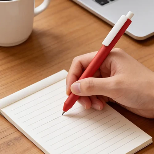 Lápiz confeccionado en ABS, con clip en color blanco. Apertura con pulsador retractil. Tinta azul.