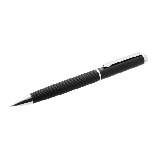 Lapiz de cuerpo metálico en acero con detalles en negro. Cuenta con tinta azul y apertura con medio giro. Medidas: 13,8 x 1,3 cm.