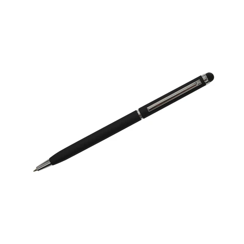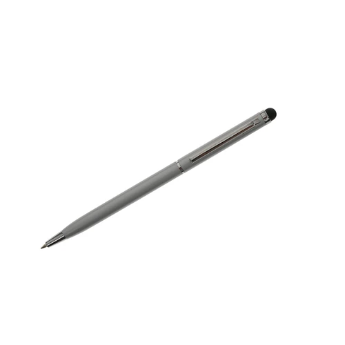Lápiz de metal de diseño elegante con clip y apertura medio giro. Posee touch para pantallas táctiles. Tinta azul