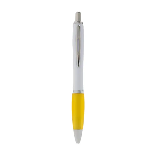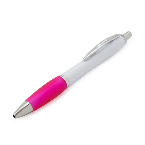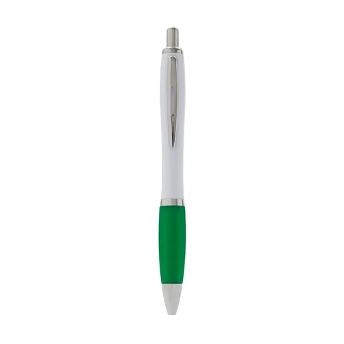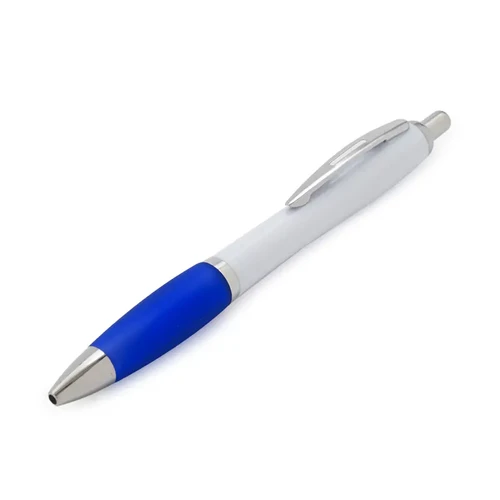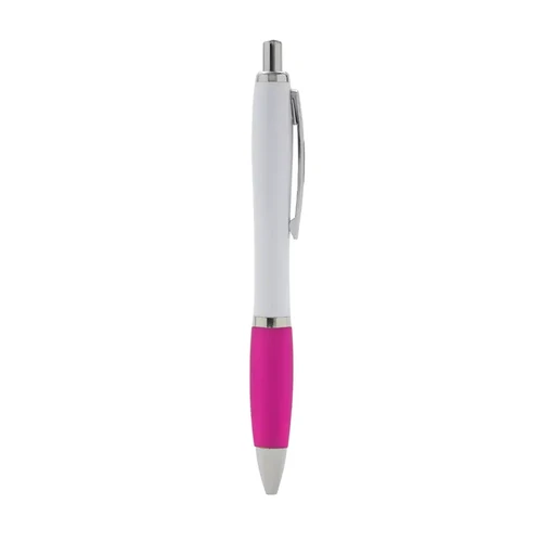 Bolígrafo con cuerpo curvo plástico en acabado blanco. Cuenta con grip de goma de color, clip y botón metálico, mecanismo retráctil y tinta azul.