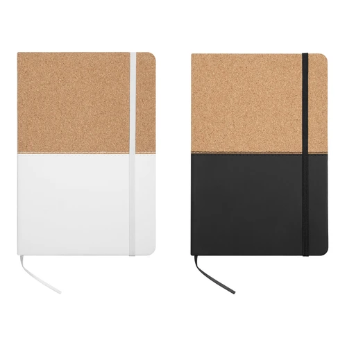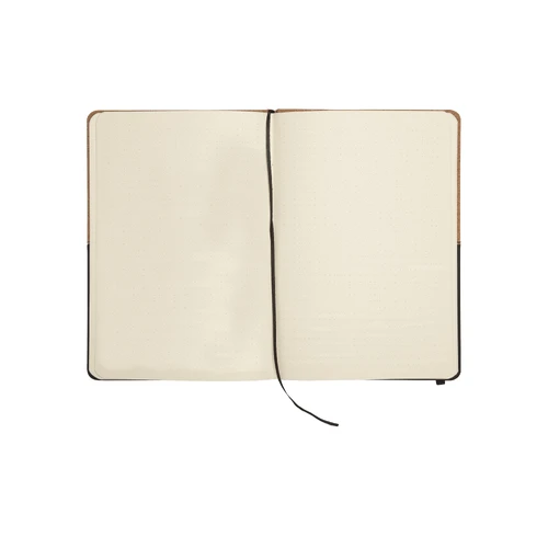 21 x 14,2 x 1,3 cm (cerrado) 21 x 28 x 1,3 cm. (abierta) Libreta de símil corcho y PU con detalle de costura. 80 hojas con renglones punteados, señalador de tela y elástico de color que cierra o sostiene la hoja.
