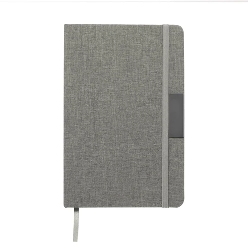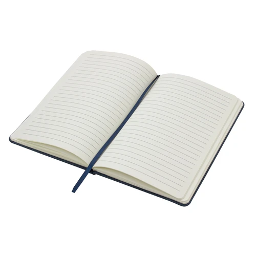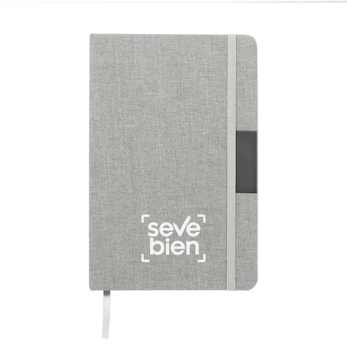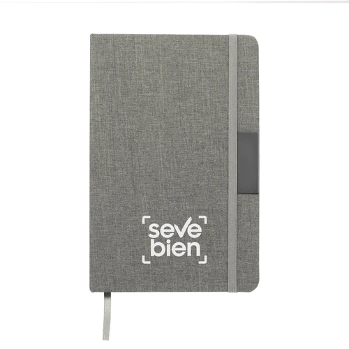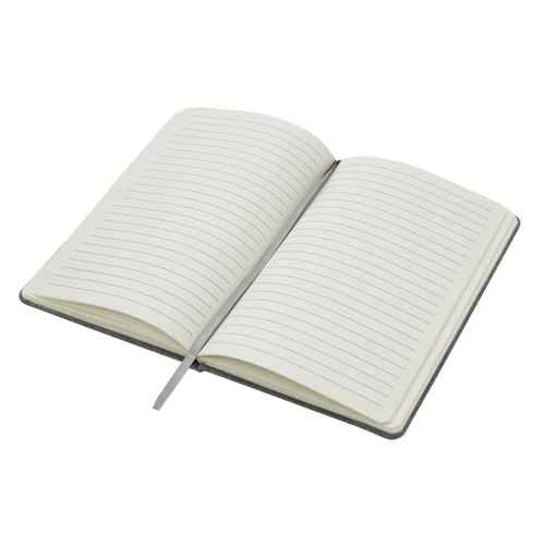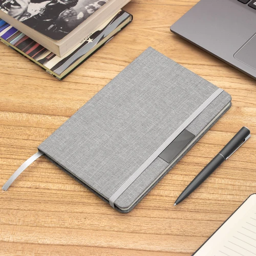 Sostenibilidad elegante.Libreta con placa metálica. Tapa de cartón de 300g recubierta en RPET 310. Placa metálica de 5 x 2 cm. Interior de 80 hojas rayadas en papel obra de 70g. Encuadernación cosida. Cierre con banda elástica del mismo color de la tapa.Medidas: 14 x 21 x 1,5 cm.