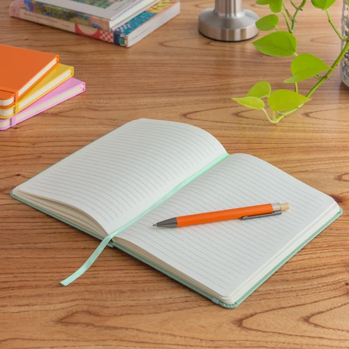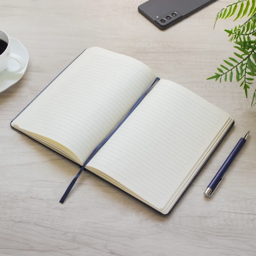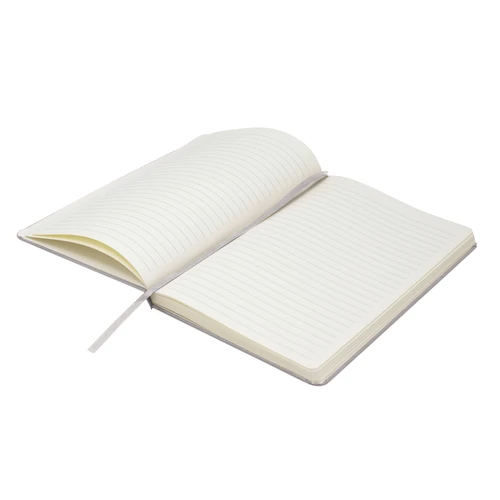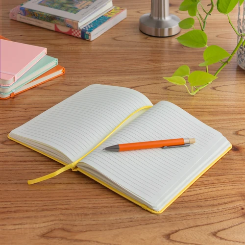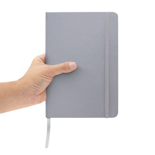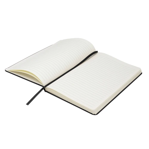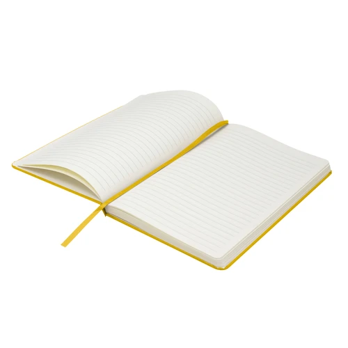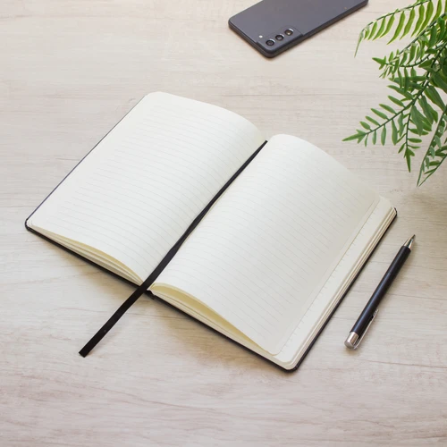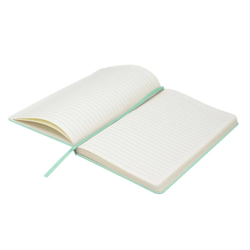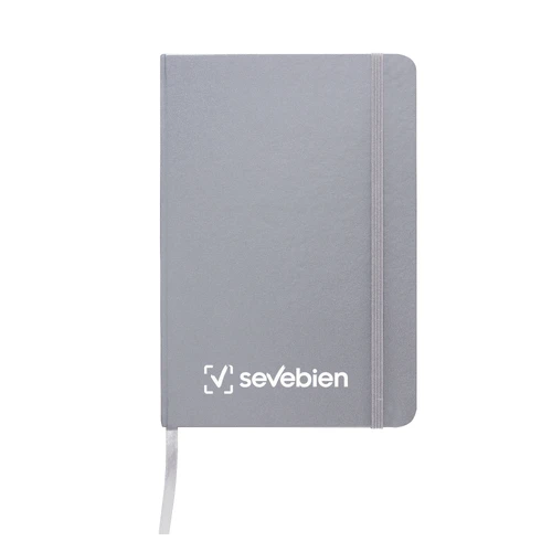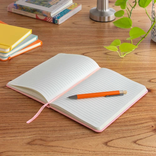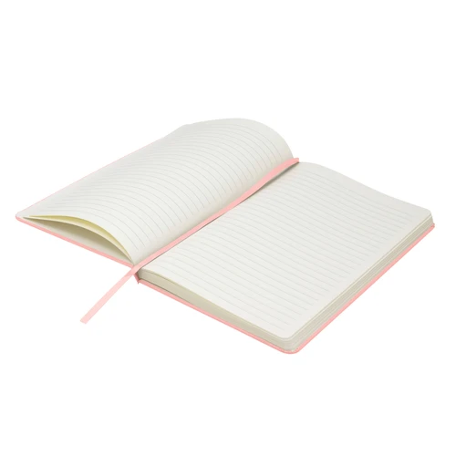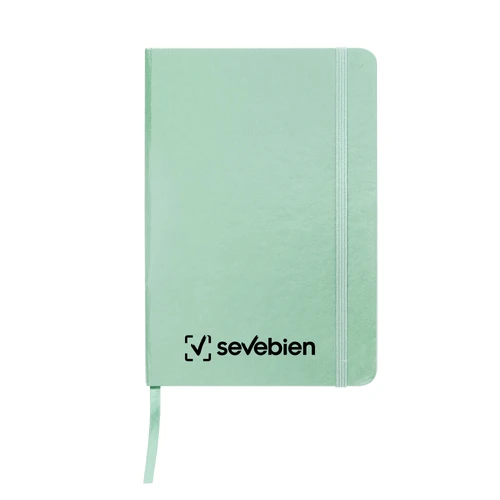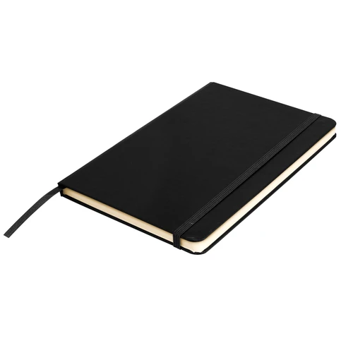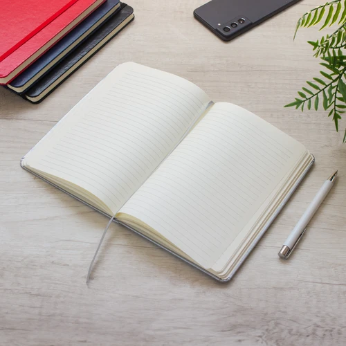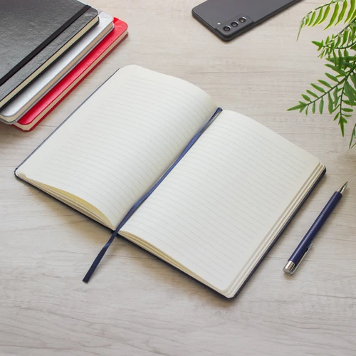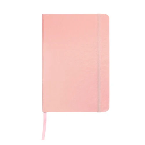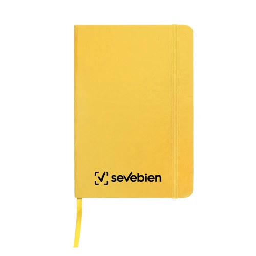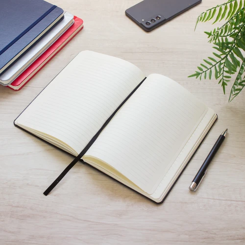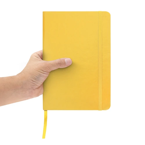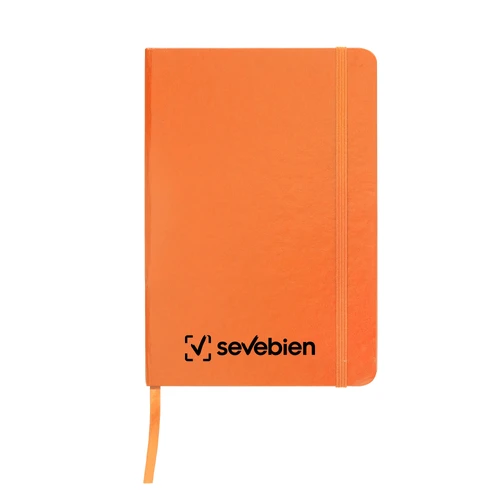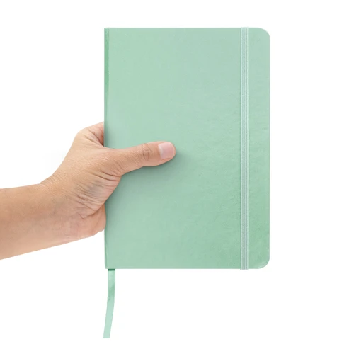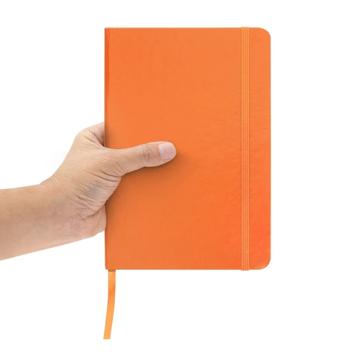 Mantén tus ideas organizadas.Libreta. Tapa de cartón de 300g recubierta en poliuretano de diferentes colores. Interior de 80 hojas rayadas en papel obra crema de 70g. Encuadernación cosido. Incluye cinta señaladora del color de la tapa. Cierre con banda elástica del mismo color.Medidas: 14 x 21 x 1,5 cm.