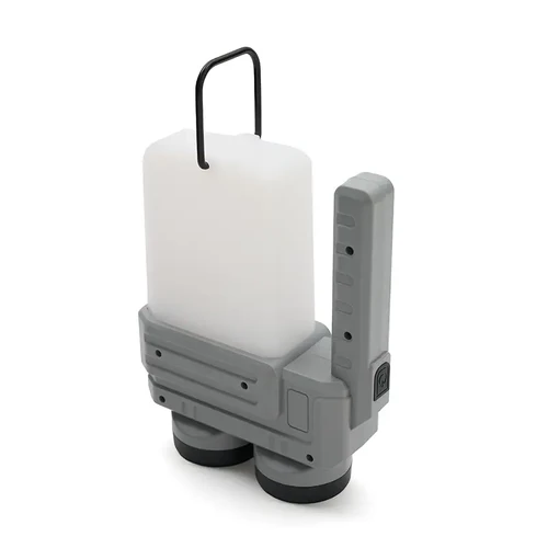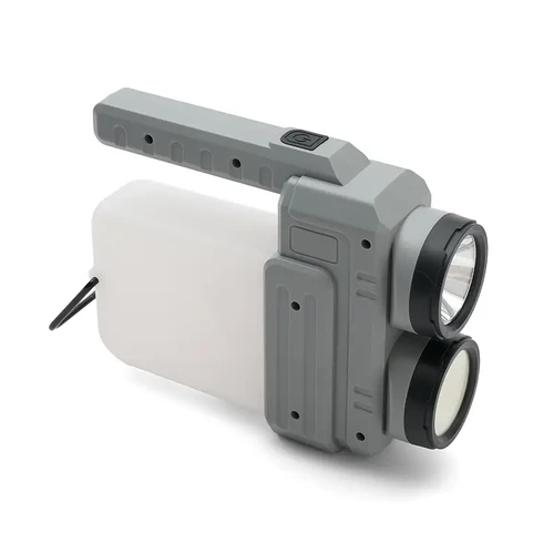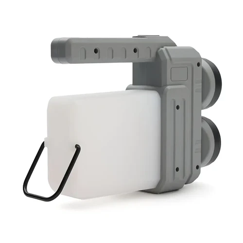 Lámpara fabricada en ABS + PP. Su diseño versátil ofrece dos tipos de agarre: una manija ergonómica para un mejor control en modo linterna y una manija tipo "cuerda", ideal para colgar y utilizar como farol.