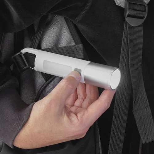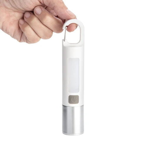 Luz potente siempre a tu alcance.Linterna portátil recargable. Con mosquetón incorporado. Luz de emergencia y 2 intensidades de iluminación (alta e intermitente). Batería recargable 800 mAh. Fuente de luz 7 leds de alta potencia. Puerto USB-C oculto (se desplaza el cuerpo hacia arriba). Cable de carga color blanco. Medidas: Ø 3 cm x 15,8 cm.