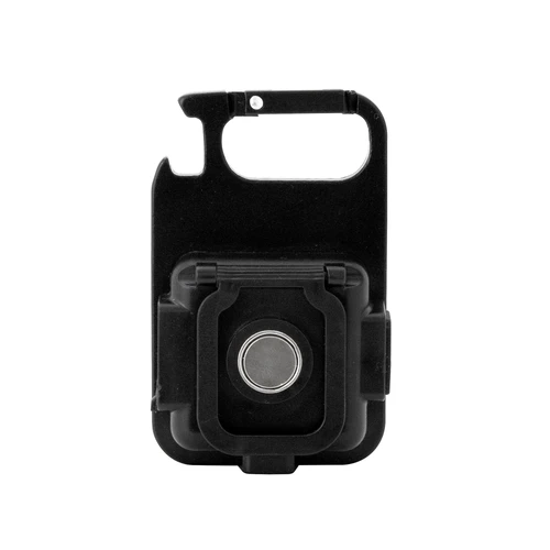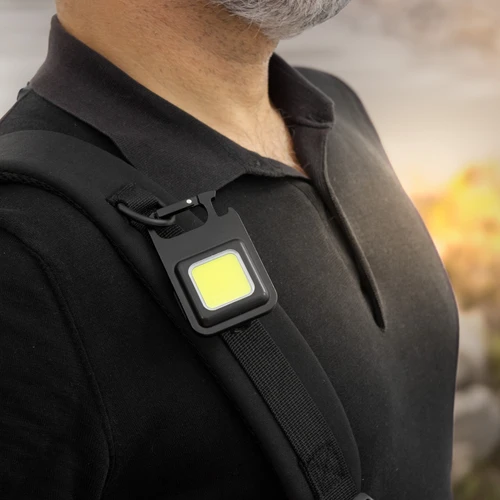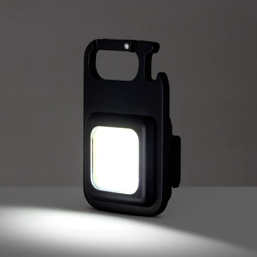 Potente, compacta y moderna.Linterna portátil recargable. Con destapador y mosquetón incorporado. Imán al dorso y soporte con pie para diferentes posiciones. Luz led de alta potencia: 3 intensidades de iluminación (alta, baja e intermitente). Batería recargable de 300 mAh. Luz led indicadora de carga. Puerto USB-C y cable de carga de 30 cm de largo color negro. Medidas: 7,2 x 4,5 x 2 cm.