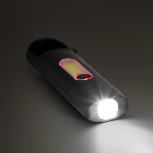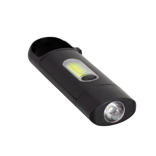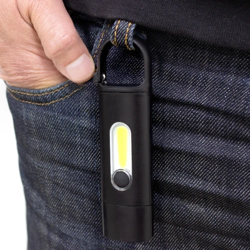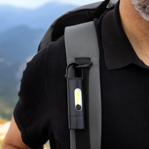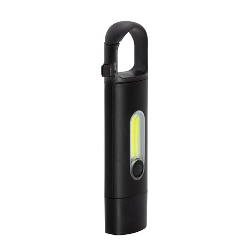 Perfecta para llevar en tu mochila.Linterna portátil recargable. Con mosquetón incorporado. Luz de emergencia y 3 intensidades de iluminación (alta, baja e intermitente). Batería recargable de 200 mAh. Puerto USB-C y cable de carga de 30 cm de largo color negro. Medidas: 11 x 3 x 1,5 cm.