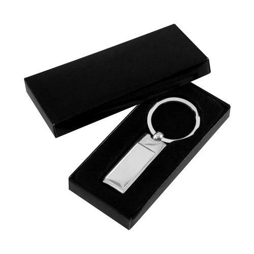 Llavero Metálico Rectangular. Presentación en estuche laminado negro con cuna aterciopelada.