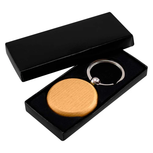 Llavero Redondo de Madera de Bamboo. Presentación en estuche laminado negro con cuna aterciopelada.