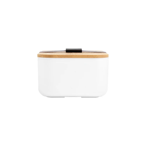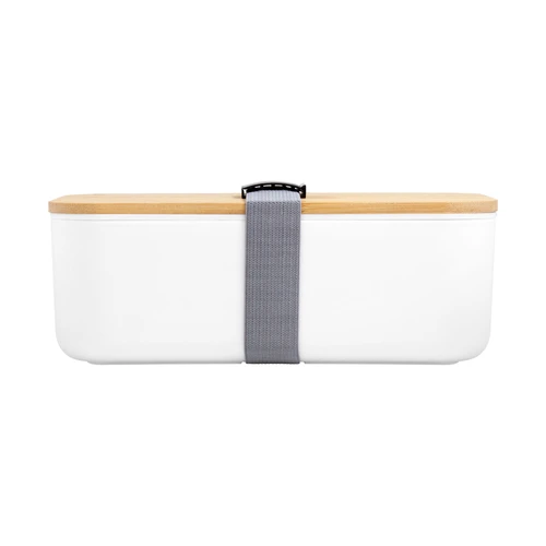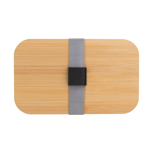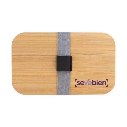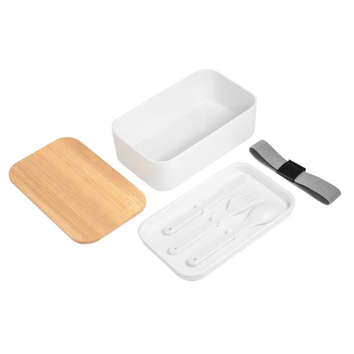 Contiene cubiertos. Perfecto para el almuerzo en la oficina.Contenedor de alimentos con tapa de Bambú. Posee un compartimento plástico y bandeja porta set de 3 cubiertos (cuchillo, tenedor y cuchara). La tapa de bambú debe presionar firmemente la bandeja donde se fija el juego de cubiertos. Cierre con sujeción elástica color gris y hebilla plástica color negro. Producto apto para microondas (sin la tapa). Importante: solo se puede calentar la comida, NO sirve para cocinarla.Medidas: 19,2 x 11,5 x 7 cm.