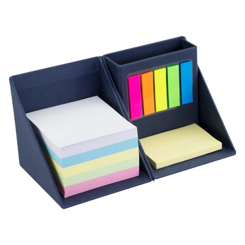 Memo set Ecológico retráctil con forma de Cubo en Cartón. Incluye 500 hojas de notas cuadradas de colores, 50 notas adhesivas amarillas medianas, 125 banderitas adhesivas de colores y un compartimento porta-lápices.