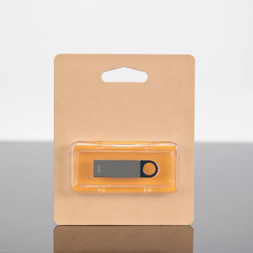 Mini - USB Pendrive USB 2.0 con 32GB de memoria, cuerpo metálico y espacio redondo para colgar. Presentación en práctico blister de cartón reciclado con ranura para ganchera, y estuche plástico translúcido para remover el pendrive directamente.