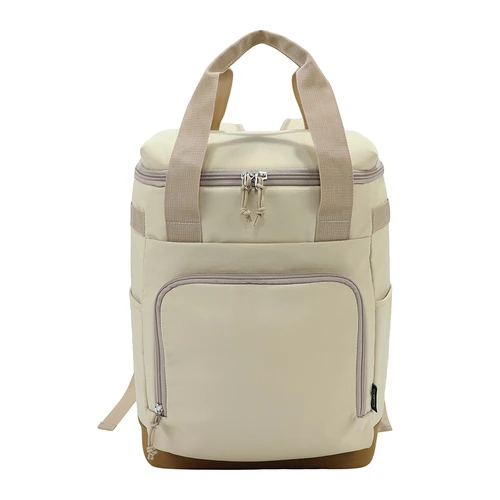 Mochila cooler con exterior "GREENLAND" de tela PET reciclada (RPET) color beige e interior térmico aislante de PEVA y acolchado con esponja PE FOAM. Incluye bolsillo delantero, 2 bolsillos laterales, mango y cierre-eclair con apertura 240°. Base de Nylon Ripstop impermeable color café. Capacidad 16L.