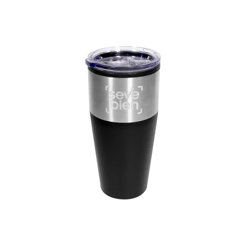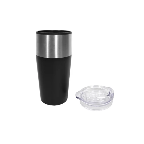 Ø 8,5 x 18 cm. Capacidad 600 ml. Plástico y acero inoxidable. Doble pared. Interior de polipropileno (PP) y exterior combinado con acero inoxidable 201. Tapa plástica transparente a presión con anillo de silicona. Presentación en caja de regalo.