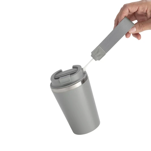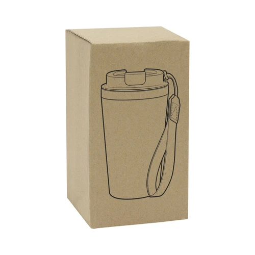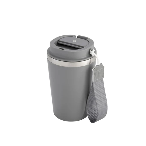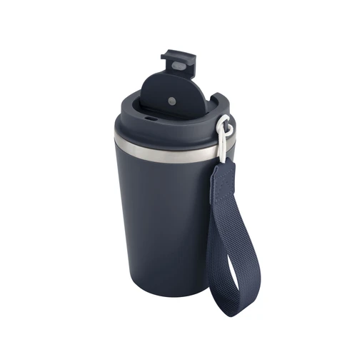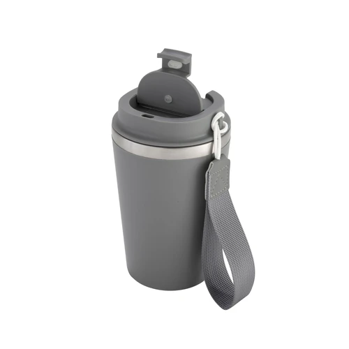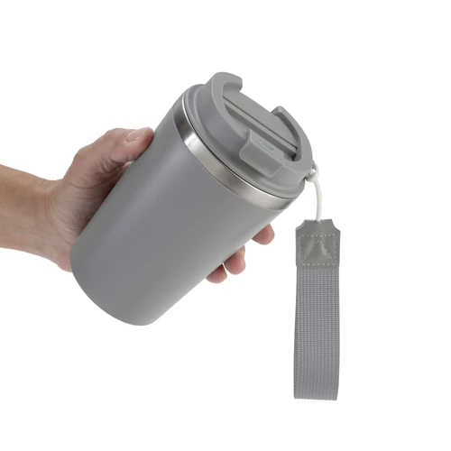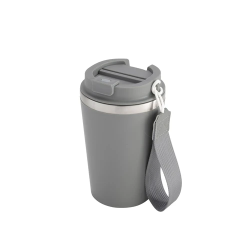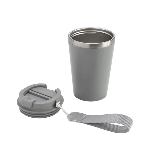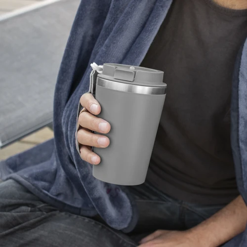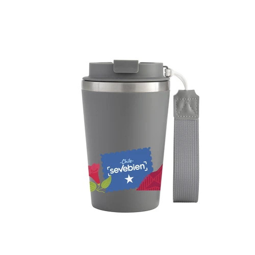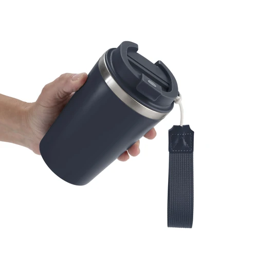 Perfecto para llevar en el día a día.Mug doble pared con asa colgante. Interior de acero inoxidable 304 y exterior de Polipropileno con acabado mate. Tapa a rosca de polipropileno con anillo de silicona y seguro antiderrame del mismo color del mug. Asa de poliuretano y poliéster.Medidas: Ø 8,9 cm x 15 cm.