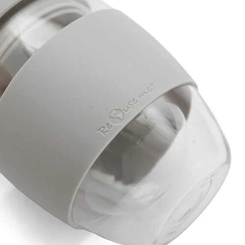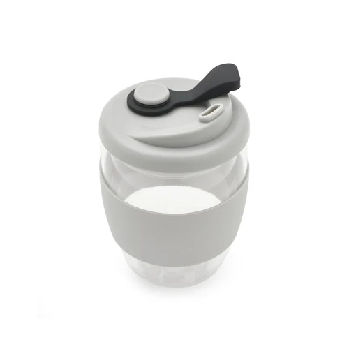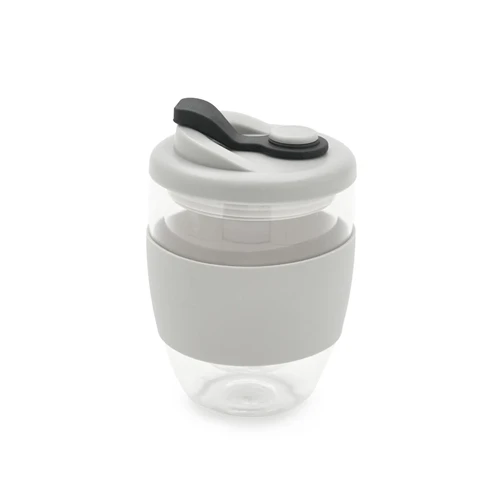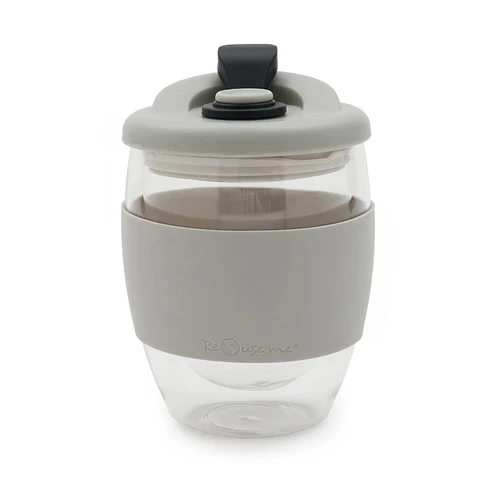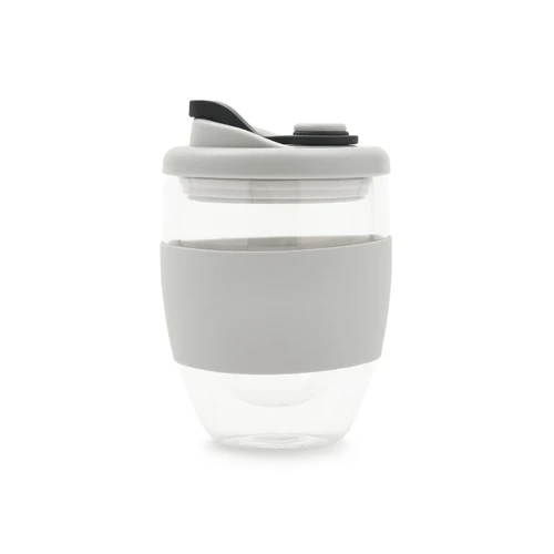 Mug reutilizable confeccionado en vidrio de doble pared de borosilicato. Gracias a su doble pared, no transmite el calor de la bebida a la manos. Cuenta con tapa con boquilla con cierre a presión y banda de silicona gris antideslizante personalizable. Capacidad: 350 ml. Medidas: 14,5 x 8,5 (Altura x Diámetro). Incluye Gift Box confeccionada en cartulina Kraft.